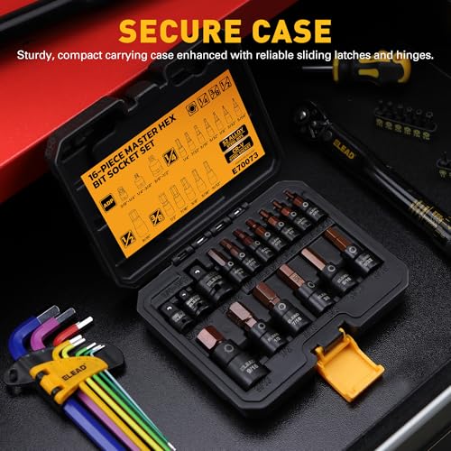 Multi-size Coverage – This 16-piece set covers all your needs, including 1/4″ drive (5/64”, 3/32”, 1/8”, 5/32”, 3/16”, 7/32”, 1/4”), 3/8″ drive (9/32”, 5/16”, 3/8”, 7/16”, 1/2”), and 1/2″ drive (9/16”), plus 3 socket adapters. Each socket features a detent pin hole for added stability and precision.