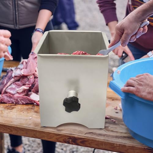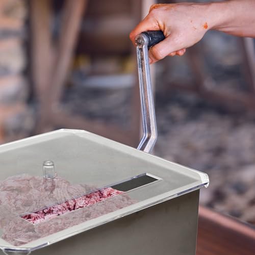 [Easy To Use]: Place chosen meat in tub and cover; Turn handle and add dissolved seasoning through pour slot; Mix until meat becomes tacky, then press into burger patties or use a sausage stuffer for snack sticks and ring meats