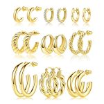 - Trendy Gold Hoop Earrings Set: You will get 9 pairs of gold earrings of different designs come with small huggie earrings, gold hoops, gold chunky hoops, twist hoop earrings, earring jackets etc.The hoops all look very trendy and fancy.You can wear it alone or wear several together.Perfect for all occasions and outfits.Gold huggie earrings are dinaty and look more expensive. It makes you more elegant and charming.