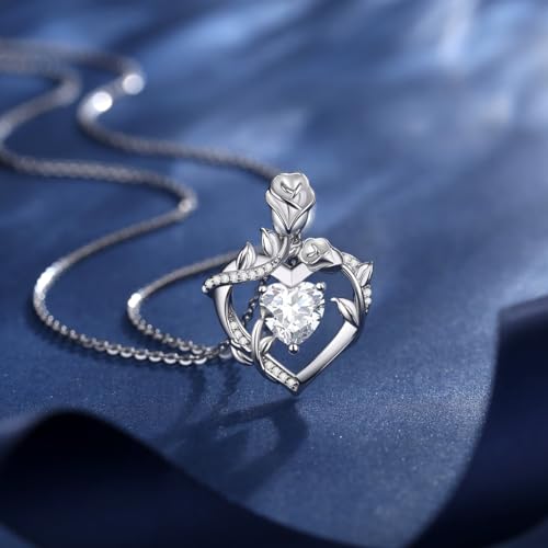 AGVANA Christmas Gifts Dreamy Rose Birthstone Necklace for Women Sterling Silver Rose Flower Heart Necklace Fine Jewelry Anniversary Birthday Gifts for Women Wife Mom Her, Length: 18″+2″