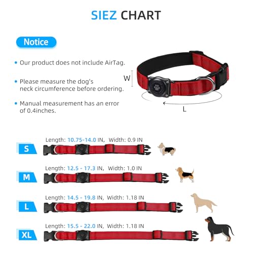 Wide Range of Sizes: Adjustable AirTag collar is available in 4 sizes. (S=10.75-14”, M=12.5-17.3”, L=14.5-19.8”, XL=15.5-22”) Please measure the circumference of your puppy’s neck before purchasing. Package contains: 1* Apple Air Tag dog collar, 1* screwdriver (AirTag is NOT INCLUDED)