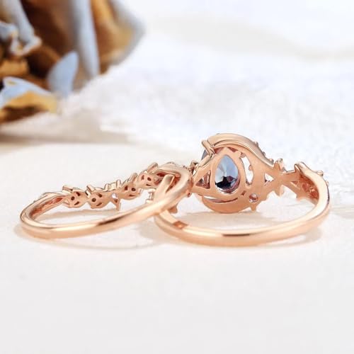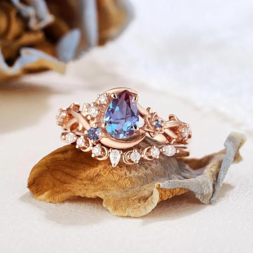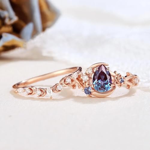 Alexandrite Engagement Ring for Women 1CT Pear Cut Alexandrite Moon Engagement Ring Crescent Moon S925/10K/14K/18K Wedding Band Set Handmade Moissanite Curved Wedding Band Set Gift For Her Size3-13