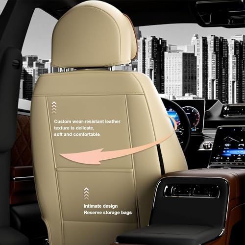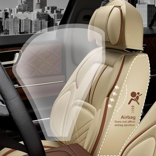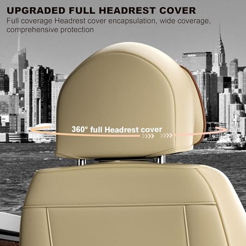 ASLONG 5PCS 2025 Front and Back Car Seat Covers Auto Interior Accessories with Water Proof Nappa Leather for Cars SUV Pick-up Truck Universal Comfortable and breathable (Full Set, Beige)