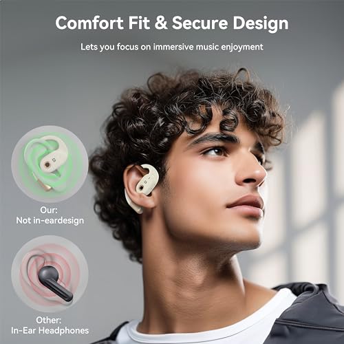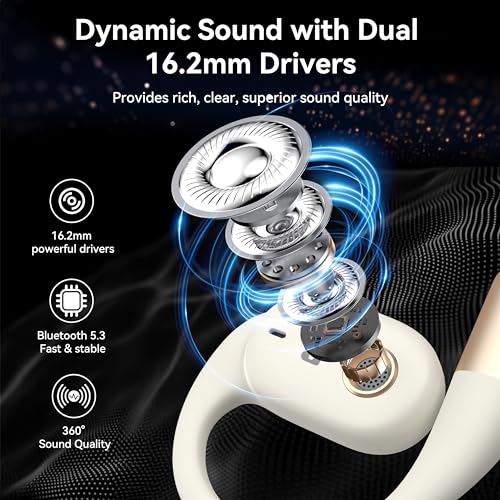 【360° Super Sound Wireless Headphones】The open ear earbuds utilizes dual 16.2mm powerful dynamic drivers, three times larger than typical wireless headphones, creating stunning top-notch sound. The wireless bluetooth headphones utilize top-of-the-line bio-diaphragm technology that makes you feel like you’re in a concert hall listening to music, from crisp, clear highs to exciting, powerful lows, the high-definition stereo sound provides you with an immersive listening experience. In addition, the wireless bluetooth headphones utilize directional sound conduction technology to protect your privacy without the embarrassment of sound leakage