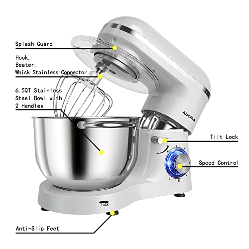 Aucma Stand Mixer,6.5-QT 660W 6-Speed Tilt-Head Food Mixer, Kitchen Electric Mixer with Dough Hook, Wire Whip & Beater (6.5QT, White)