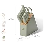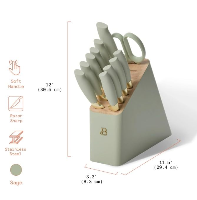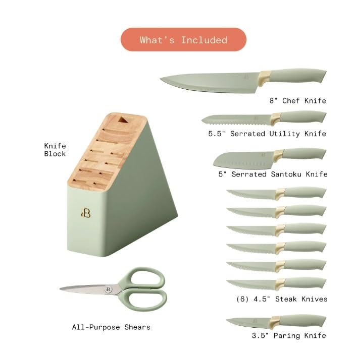 12 Piece Knife Block Set features a variety of knives and all-purpose shears to slice, dice, mince, cut, and more. Innovative knives and scissors feature white soft grip handles with our signature gold accents that fit comfortably in your hand. Durable stainless steel blades feature a stick resistant, resin coating that limit food from adhering to the knife and allow for easier, more efficient cutting. Store and display in our signature knife block that will look B͏e͏a͏u͏t͏i͏f͏u͏l on your kitchen counter. 12 Piece Knife Block set includes: 8-inch chef knife, 5.5- inch serrated utility knife, 5-inch Serrated Santoku knife, 3.5- inch paring knife, (6) 4.5-inch Steak Knives, All Purpose Shear, White Block. Knives and shears are hand-wash only; wipe block clean with a damp cloth. Elevate your culinary experience with the B͏e͏a͏u͏t͏i͏f͏u͏l 12 Piece Knife Block Set, a stunning collaboration between Drew Barrymore’s aesthetic vision and precision kitchen craftsmanship. This thoughtfully curated set is designed to not only meet the demands of your culinary tasks but also to add a luxurious and stylish accent to your kitchen space.