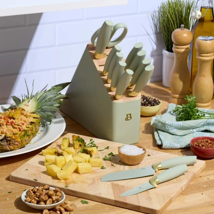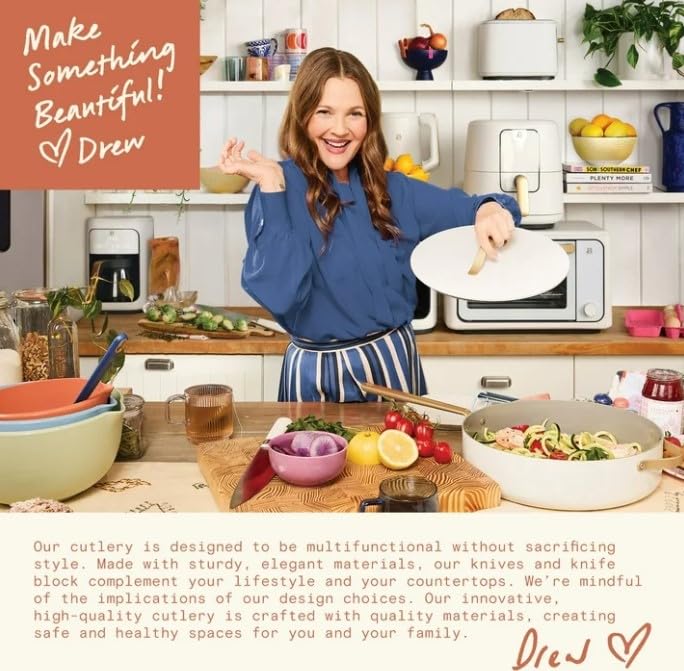 Drew Barrymore Collaboration: This knife block set is a result of a collaboration with Drew Barrymore, bringing a touch of celebrity-inspired style to your kitchen. Drew’s influence is evident in the set’s design and functionality.