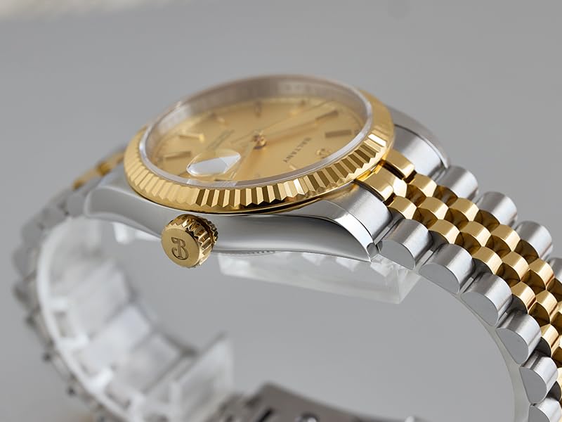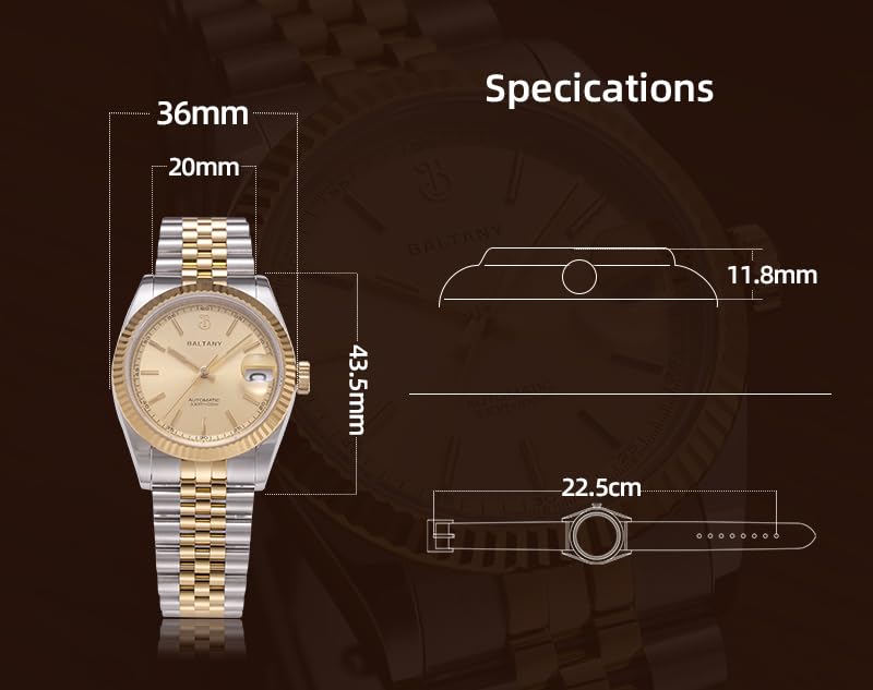 Model: Baltany Gold Fluted Bezel 36mm Retro Dress Watch S4084 Movement: NH35 Automatic Case: 316L Stainless Steel, Brushed Case Diameter: 36mm Dial: Silver/Gold/Burgundy Gradient, Applied Hour Markers with Luminous Bezel: Stainless Steel Fluted Bezel, Steel Color/Gold Lug to Lug : 43.5mm Thickness: 11.8mm (including glass) Crystal: Flat Sapphire,with Cyclops, Coating Hands: Polished, with Luminous Crown: Screw-in, 316L Stainless Steel,with LOGO Caseback: Screw-in,316L Stainless Steel Bracelet: 316L Stainless Steel, 5 Piece Links Jubilee Style Bracelet, Two Tone(gold & Burgundy dial)/Steel Color(silver dial) Strap Width: 20mm Buckle: 316L Stainless Steel, Brushed, Etching LOGO Waterproof: 100M(10ATM) Weight: About 118g