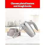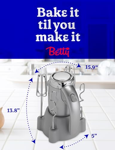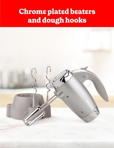 This Betty Crocker 7-Speed Power Up Hand Mixer with Stand in Silver is your number 1 kitchen sidekick to bake someone happy. When it comes to easy-to-use ergonomic kitchen tools, this handheld electric mixer is your solution to creating mouthwatering dishes, meals, and treats. With 250 watts of power and a turbo 300 watts at peak power, this mixer is considered a top household item for its versatility and easy storage. When it comes to high-quality kitchen appliances, especially hand blenders for kitchen, this mixer comes with necessities like hand mixer beaters and dough hooks. Whether you’re using each dough whisk to share the joy of homemade for a special occasion or selecting one of 7 mixing speeds for cake batters, mashed potatoes, or homemade whipping cream, the beaters for the hand mixer ensure thorough and quality mixing each and every time. Also included is a storage stand so you can place your new hand mixer upright when not in use. Easily select your speed thanks to an intuitive speed selector switch and press the beater eject button when finished. When it comes to mixin’ it up, Betty’s got your back.