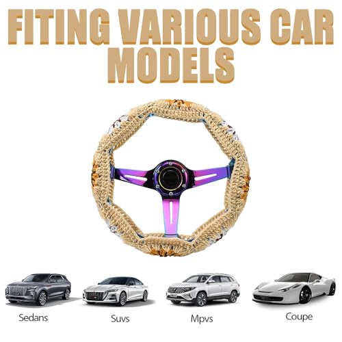 Features: 1. Universal Fit: It can accommodate most standard-sized steering wheels (approximately 14-15 inches in diameter). 2. Comfortable Material: Made with high-quality dacron, our steering wheel cover is soft, and provides a comfortable touch while offering comprehensive protection for your steering wheel 3. Wide Compatibility, Multi-Purpose: Our crochet steering wheel cover is suitable for various car models and brands, such as sedans, SUVs, MPVs, etc. It not only adds a touch of style to your car, but also serves as a fashionable interior decoration 4. High-quality handmade craftsmanship:Crafted with care and attention to detail, these steering wheel accessories are handmade from high-quality materials. This ensures durability, comfort, and a snug fit, enhancing your driving experience. Packing Includes: 1 x Steering Wheel Cover