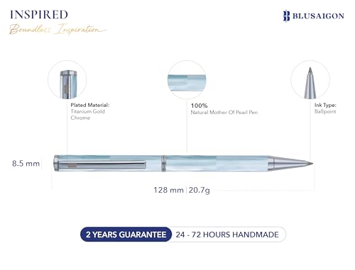 This twist-action ballpoint pen is handcrafted by Vietnamese artisans. German-made refill Schneider Express 785M ensures exceptional writing quality. Perfectly balanced in your hand, the glossy design showcases a solid brass barrel meticulously inlaid with natural mother-of-pearl and coated with nano layers for enduring durability and timeless beauty