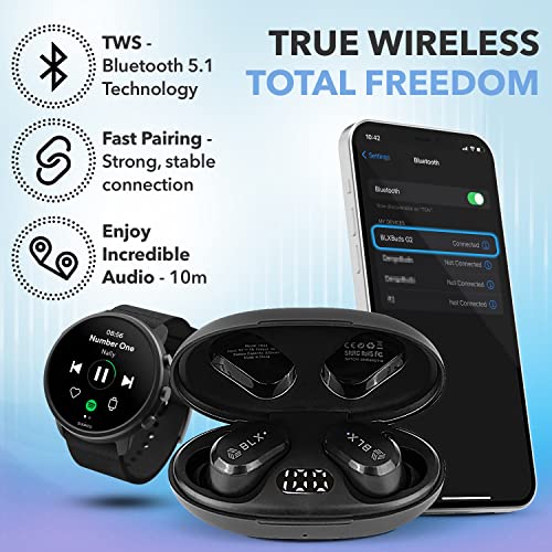 BLXBuds G2 True Wireless Earbuds – Small Bluetooth Ear Buds for iPhone Android | IPX3 Sweat-Resistant, Dual Microphone, 5 Hour Battery | Running, Workout Headphones with Earbud Charging Case