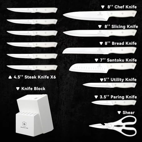 BRAVESTONE Knife Set, 15 Piece Kitchen Knife Set with Block Self Sharpening, Dishwasher Safe, Anti-slip Handle (Cream)
