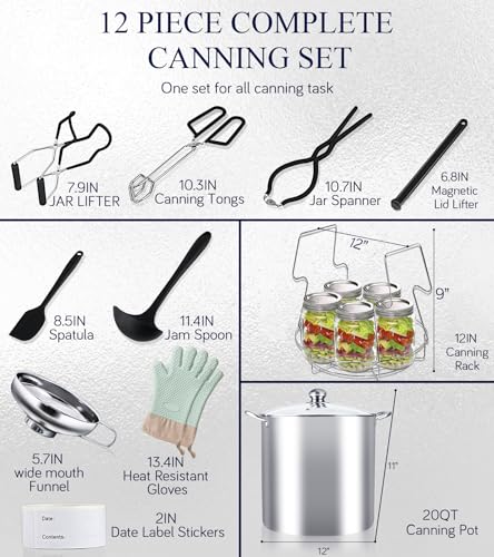 - You will get – everything you need to create culinary masterpieces! This set includes a stainless steel canning pot, a collapsible stainless steel canning rack, a stainless steel canning funnel, canning tongs, a jar lifter, a magnetic lid lifter, a jar wrench, a stirrer, a jam ladle,a date labeling stickers and high temperature resistant gloves. Get started on your canning journey with the Vigaminmn Canning supplies starter kit tools for the job!
