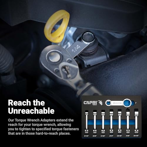 Capri Tools 1/2 in. Drive Torque Adapters extend the reach for your torque wrench, allowing you to tighten to specified torque fasteners in hard-to-reach places. Each torque adapter is 3 in. long from center to center, making it easy to recalculate the torque setting required. The adapters come with 12-point box end which gives you more angles and tighter swing. Our WaveDrive box end design transfers torque uniformly and prevents damaging and rounding of the bolt. MaxChrome plating, impeccably polished and finished with careful application of chrome protective plating, ensures durability and corrosion resistance. Large stamped sizing won’t fade over time. 8-piece SAE set: 9/16, 5/8, 11/16, 3/4, 13/16, 7/8, 15/16, 1 in. Comes in our own spill-resistant Mechanics Tray for easy organization and storage. Tray dimensions: 10 in. (L) x 7 in. (W) x 1-1/4 in. (H), fits comfortably in most tool chests and cabinets.