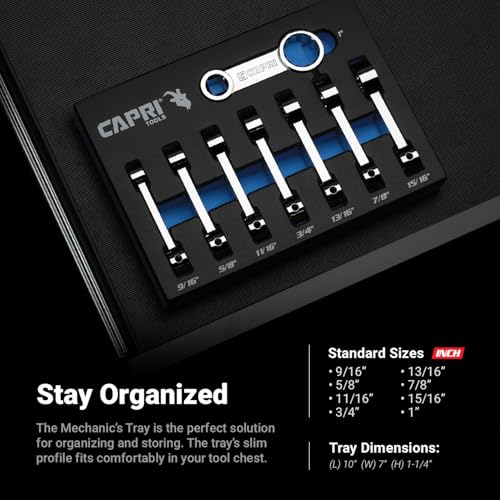 8-piece SAE set: 9/16, 5/8, 11/16, 3/4, 13/16, 7/8, 15/16, 1 in. Comes in our own spill-resistant Mechanics Tray for easy organization and storage. Tray dimensions: 10 in. (L) x 7 in. (W) x 1-1/4 in. (H), fits comfortably in most tool chests and cabinets