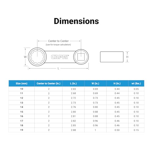 The Capri Tools Torque Adapters extend the reach for your torque wrench, allowing you to tighten to specified torque fasteners in hard-to-reach places. Each 3/8 in. drive torque adapter is 2 in. long from center to center, making it easy to recalculate the torque setting required. The adapters come with 12-point box end which gives you more angles and tighter swing. Our WaveDrive box end design transfers torque uniformly and prevents damaging and rounding of the bolt. MaxChrome plating, impeccably polished and finished with careful application of chrome protective plating, ensures durability and corrosion resistance. Large stamped sizing won’t fade over time.