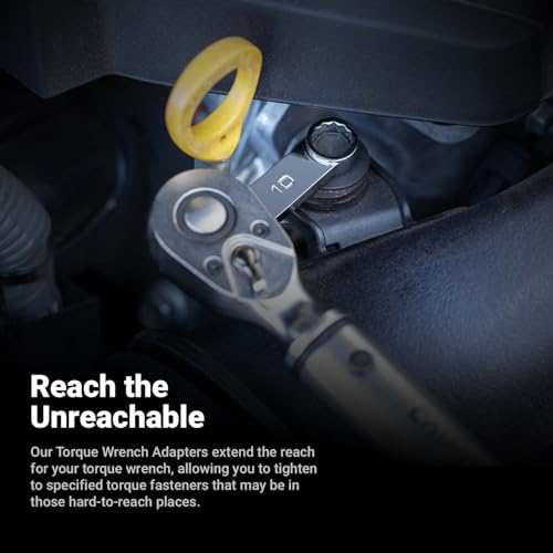 The torque adapter extends the reach for your torque wrench, allowing to tighten fasteners in hard-to-reach places to specified torque