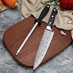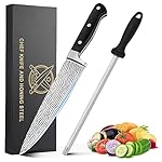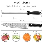 【Multi-functional knife sharpening rod】The chef’s knife comes with an 8″ long sharpening rod. The fine and uniform honing surface of honing steel can keep a good blade without wearing your knives, which is a highlight of the kitchen. In addition, the handle of the honing steel is ergonomic, non-slip, comfortable to hold, and the honing steel have a large stop to protect finger, so you don’t have to worry about being injured when sharpening