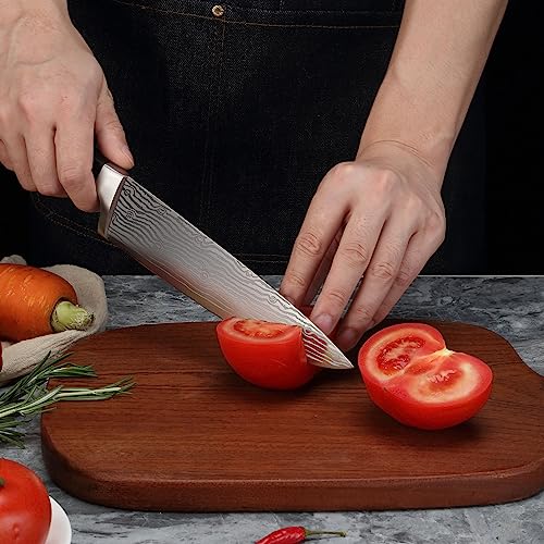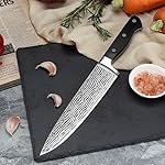 【Extremely sharp blade】 Our chef’s knife is made of high quality stainless steel, With a thickness of 2 mm, and the delicate Damascus laser pattern on the surface of the knife, making chef’s knife achieves the unity of sturdiness and sharpness. The sharp blade can help you make a perfect and smooth cut when cooking. More than that, the chef’s knife can handle many ingredients with ease. Dicing and cubing various meats, for example, makes meal preparation a breeze