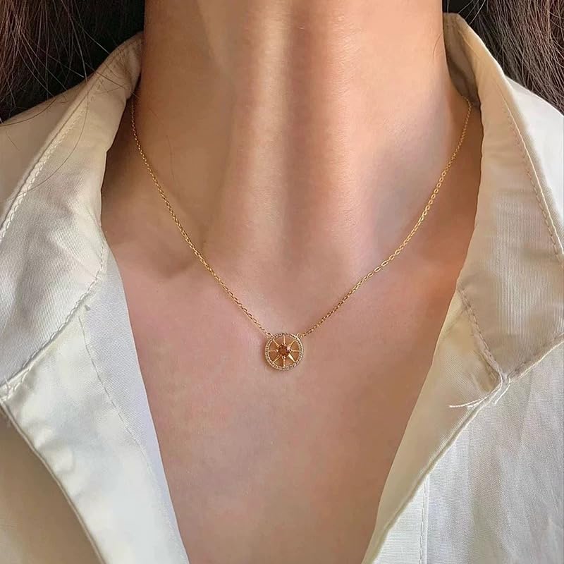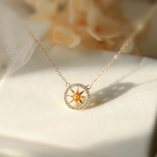 Elevate your style with this exquisite yellow crystal sun wheel pendant necklace. Crafted with precision, the pendant features a radiant citrine gemstone encircled by a halo of shimmering diamonds, creating a dazzling celestial display. The intricate sun wheel design symbolizes energy, warmth, and vitality, making it a captivating accessory for any occasion. Suspended from a gleaming gold chain, this necklace effortlessly adds a touch of luxury and sophistication to your ensemble. With its timeless beauty and meticulous craftsmanship, this pendant is sure to become a cherished piece in your jewelry collection.