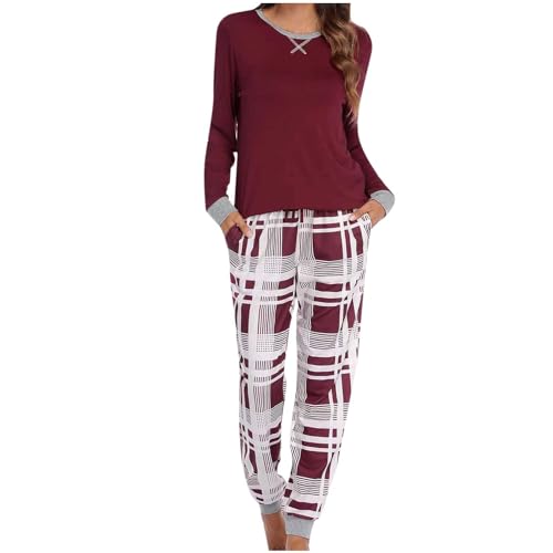 2 Piece Pajamas Set for Women Color Block Crewneck Tops Plaid Pants Casual Loungewear Set Fashion Comfort Nightwear $9.99