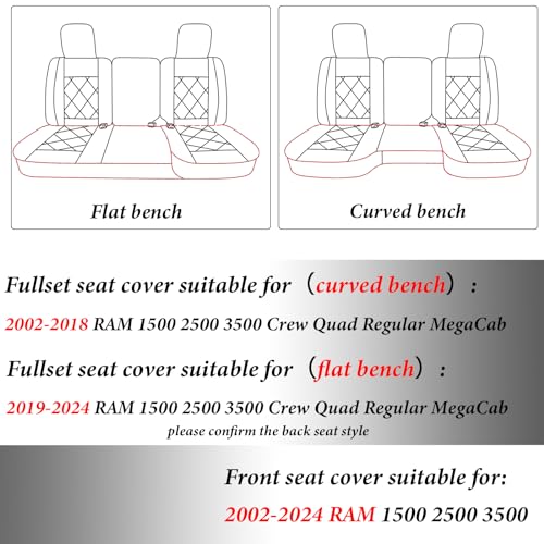 CUSTOM FIT: Our ram seat covers are specially designed to provide just the right fit for your truck. They are compatible with 2019-2024 ram 1500 2500 3500 Crew Cab, Double Cab, Quad Cab, Mega Cab. Note: customized fit for Narrow rear seats only