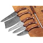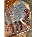 Custom Handmade Damascus Professional Kitchen knives 06 Pcs Utility Chef, Chopper/Cleaver meet,pairing knife,steak knife,and Bread knife,Santoku Knife,And Sharpner Rod with leather Case.Handle Metrial of Natural Redwood.All Knives Overall Length is : CHEF KNIFE 13’’, BREAD KNIFE 12’’, SANTOKU KNIFE 11’’, MEET CLAVER 12’’, STEAK KNIFE 9’’,PAIRING KNIFE 8’’, SHARPNER ROD 12’’.Twist Pattern with 176 Layers.50 to 54 Hardness.This Kitchen Knives Set Is Not Full Tang always clean After Use. Awesome quality.Knives will come with leather roll