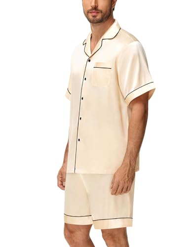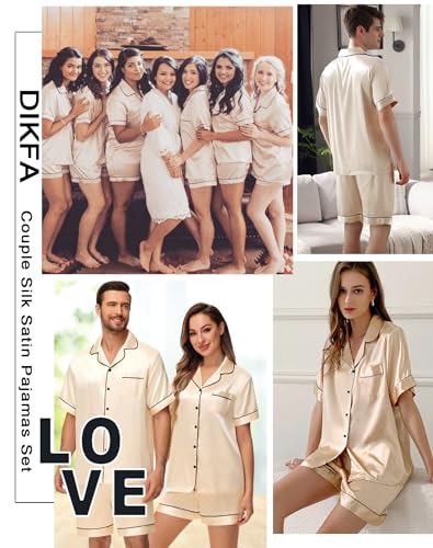 DIKFA Matching Silk Satin Pajamas Set for Couple Short Sleeve Sleepwear for Women&Men 2pcs Pjs Set Button-Down Nightwear Set
