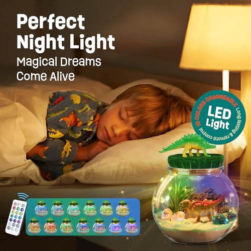 UNIQUE TERRARIUM SET: This dinosaur art kit for kids comes with magic sand, preserved mosses, a 13-colored LED night light with remote control, 5 dinosaur miniatures, dino egg miniatures, rockery miniatures, and decorative accessories. The cute arts and crafts project for kids.