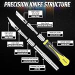 • 【Heavy Duty & Ergonomics】The blades of the crafting knife set are made of high carbon steel, high hardness and ultra sharp. The silver exactly knife’s handle is made of aluminum alloy, lightweight, relieves hand fatigue. The yellow hobby knife’s hanlde is made of silicone, non-slip and soft grip