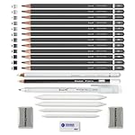 Professional Art Drawing Supplies Pencils Set: 12 Pre-Sharpened Graphite Sketch Pencils for drawing, 1 White Gel Pen Set, 1 Eraser Pencils, 2 kneaded Eraser , 1 Vinyl Eraser, 1 White Charcoal Pencil, 4 pcs Blending Stumps