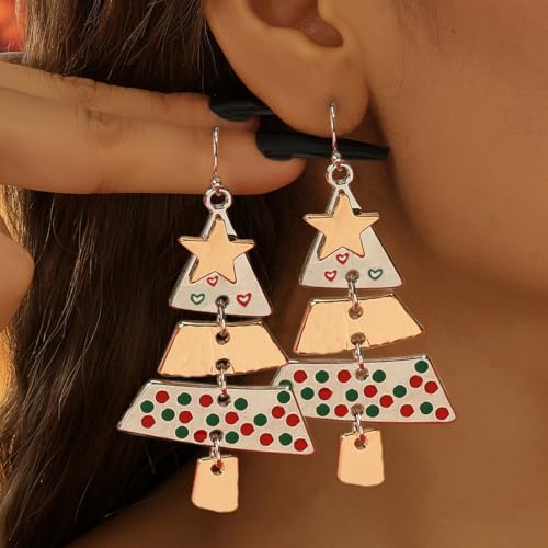 Eioi & Lmnm Stainless Steel Layered Christmas Tree Dangle Earrings for Women, Two-tone Gold Silver Dangling Xmas Tree Earrings, Multi-layer Metal X-mas Tree Drop Earrings, Cool Trendy Statement Earrings for Christmas