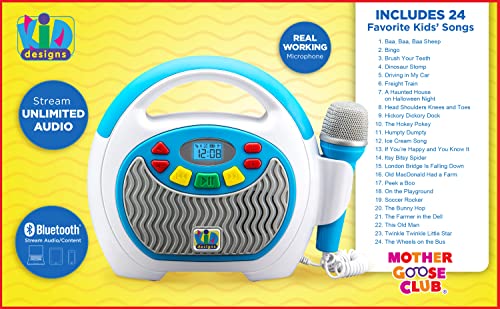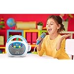 This kids karaoke microphone and speaker set features a built-in wired microphone, Bluetooth connectivity, and 24 built-in songs. Just press play and sing along to popular Mother Goose Club songs, including ‘The Farmer in the Dell’, ‘This Old Man’, ‘The Wheels on the Bus’, ‘Hickory Dickory Dock’, ‘London Bridge is Falling Down’, and many more. The karaoke microphone for kids makes it easy to sing along and put on a performance for friends and family. Plus, this USB MP3 player has a USB port to expand your content and listen to any MP3 from your collection when you connect a USB drive (not included). Product dimensions are: 10.2” L x 3.6” W x 10” H. Portable and lightweight, this kids music player makes a great gift for kids who love to sing, dance, and be the star of the show! Visit the ekids brand store to explore even more cool products for kids!