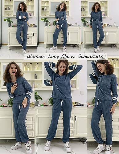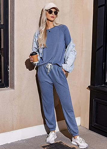 Ekouaer Lounge Sets for Women Ribbed Knit Outfits Pajamas Sets 2 Piece Long Sleeve Sweatsuits with Pockets