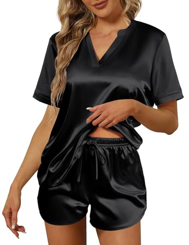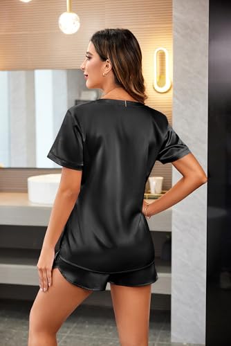 Ekouaer Silk Pajamas for Women Short Sleeve Sleepwear Two-piece Pjs Set Soft V Neck Loungewear Tops with Pj Shorts S-XXL