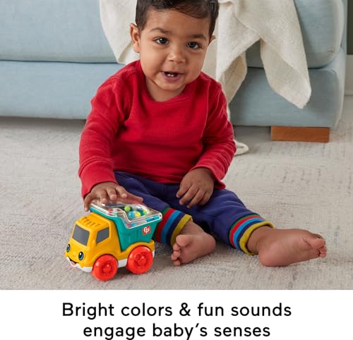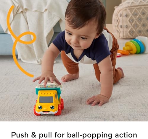Get play time popping with the Poppity Pop Dump Truck baby toy from Fisher-Price. This adorable push-along vehicle features bright colors, a friendly face and colorful beads that pop all around when baby pushes and pulls the toy! All this fun activity also encourages babies to crawl along with their ball-popping pal, helping to develop those all-important fine and gross motor skills.