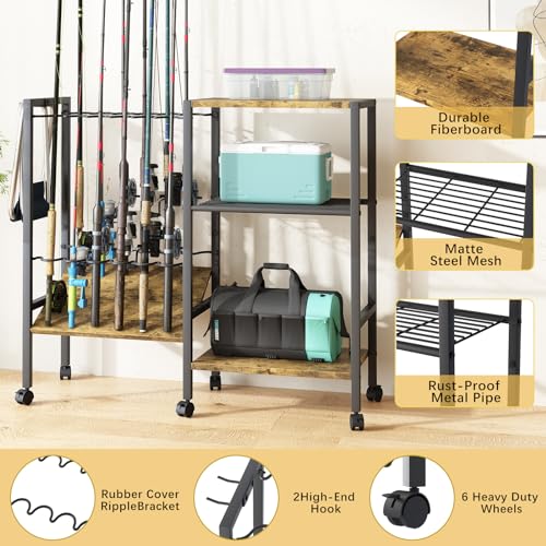Fishing Rod Rack Fishing Equipment Organizers With Wheels, Metal Fishing Gear Shelf Up To 12 Rods, Fishing Rod Holders Fishing Pole Storage Cart For Garage Home Entryway Corner