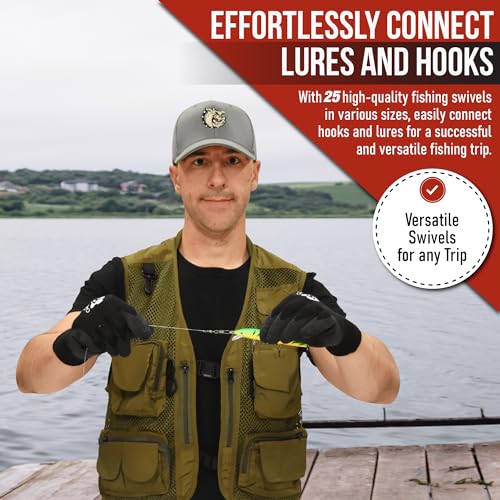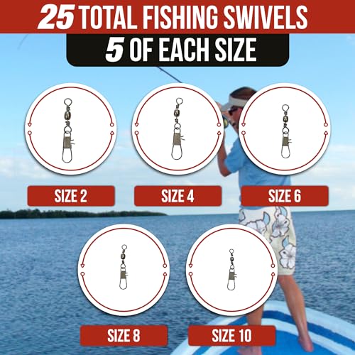 HIGH QUALITY SMALL FISHING SWIVELS AND LARGE FISHING SWIVELS – This fishing swivel variety pack consists of 25 high quality strong carbon steel fishing swivels. Work great as fishing swivel variety pack, connect your hooks with fishing swivels with snaps and snap swivels fishing swivel / snap swivels fishing, fishing hook swivel, safety snap fishing, swivel snap connectors, trout fishing swivels, swivels for fishing, fishing snaps and swivels, swivel safety snap and fishing line swivels.