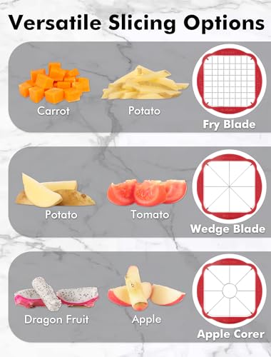 Multiple Slicing Options : Our fry cutter includes a frying blade, a slicing blade and an apple corer. Whether you’re cutting potatoes for homemade fries or other vegetables for your favorite dishes, the fry cutter offers the perfect slicing experience