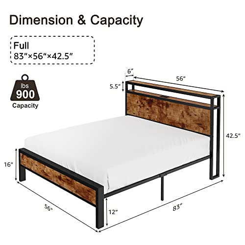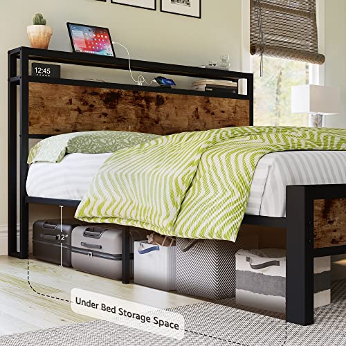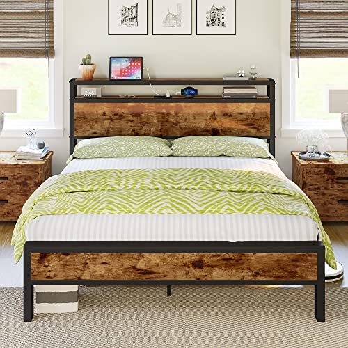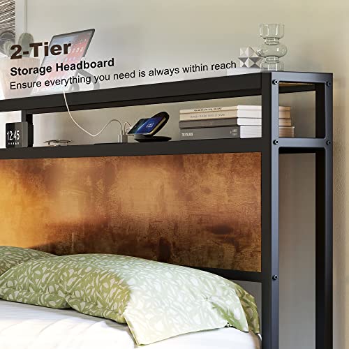 Full Size Bed Frame, Platform Bed Frame with 2-Tier Storage Headboard and Charging Station/No Box Spring Needed/Noise Free/Industrial/Rustic Brown