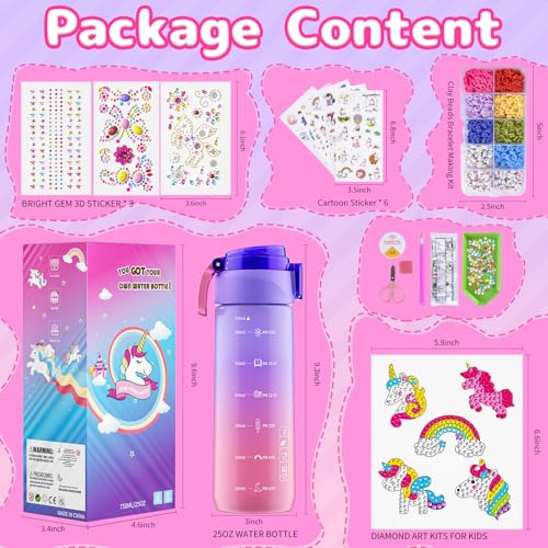 1*Unicorn Theme Diamond Arts and Crafts Kit , 1*25 OZ BOOH Water Bottle , 3D Diamond Sticker *4 and Cartoon Sticker *6 , 1*Clay Beads Bracelet Making Kit |