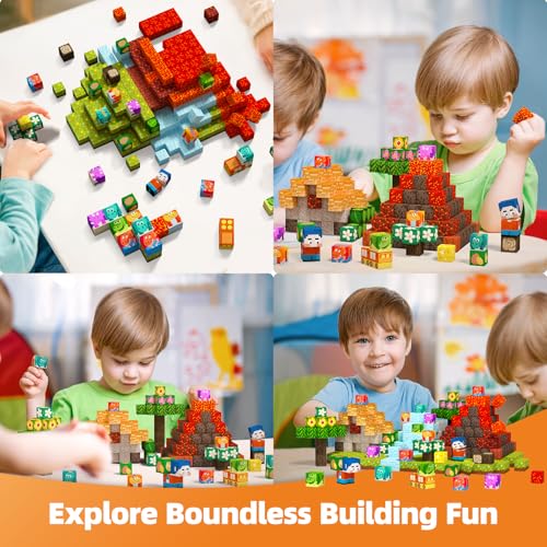 Exciting Volcano DINOSAUR Experience: GobiDex 48-piece dinosaur-themed magnetic building cubes boasts 24 diverse patterns, including dinosaurs, lava cascade, animal, plants, teaching basic science and nature worlds in a fun way, sparks creativity in kids