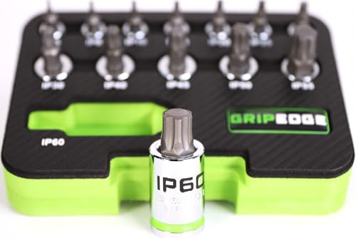 Introducing the GRIPEDGE 13-PC Star Plus Driver Set with Rounding Prevention Technology (R.P.T.). These bit sockets, made from precision-machined S2 steel, offer up to 50% more torque on good fasteners and 400% more on damaged ones compared to standard tools. The patented bi-directional geometry prevents rounding and allows removal of compromised fasteners. Features include oversize, roll stamped ink filled size markings, nickel chrome plating for corrosion resistance, and a premium plastic case with a removable foam insert. Sizes range from IP6 to IP60, ideal for most automotive applications.