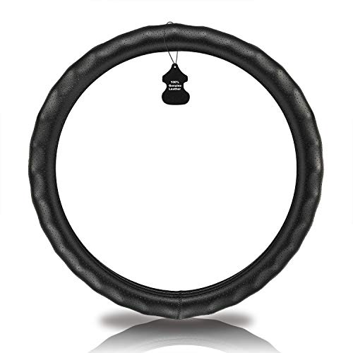 Haokay Heavy Duty Pure Cowhide Steering Wheel Cover, Black Genuine Leather Steering Wheel Cover Men Women Comfort Finger Grips Universal 14.5 to 15 Inch