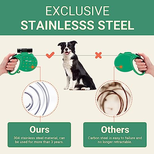Happy & Polly Retractable Dog Leash with Flashlight, Protective Bungee Leash, Convenient Hook, 16.4ft Reflective Fishing Line Weaved Strong Tape, One- Handed Release, Pause, Lock Green
