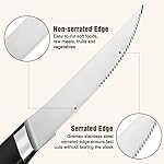 [Multi-functional Steak Knife] This steak knife has both serrated and non-serrated blades. The front part of the serrated blade allows you to quickly cut through the steak without tearing the steak. The non-serrated edge lets you cut vegetables such as potatoes and broccoli while enjoying your steak. This exquisite steak knife set is versatile and suitable for a variety of occasions, including barbecues, parties, dinner parties, camping trips and more.