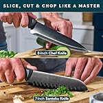 - Masterful Precision – Slice, cut, and chop like a pro with our high-quality knives. The 8.3 inch chef knife and 7 inch Santoku knife offer unmatched precision and control. Upgrade your culinary skills with these apartment must haves for the kitchen.
