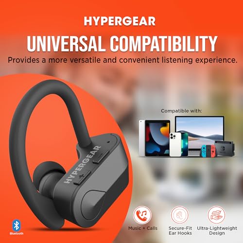 HyperGear Sport True Wireless Earbuds, Bluetooth Earbuds with Noise-Cancelling Mic, Quick-Pair, Secure-Fit Ear Hooks, Comfortable Wireless Bluetooth Earbuds for Workouts, Sweatproof, Black
