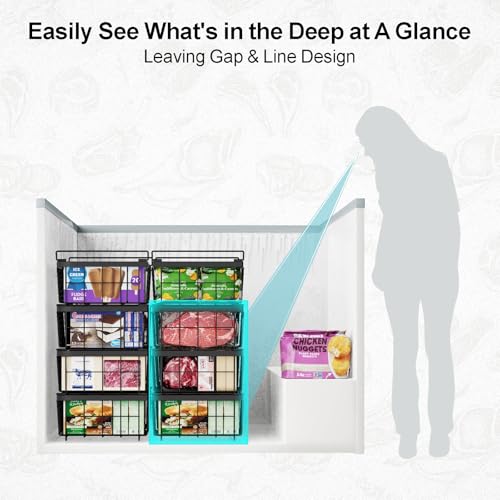 [Hold Heavier Food Not Deformed] The 20% thicker black coated wireline and rounded edges of the freezer storage can hold more heavy frozen food and prevent any scratching or tearing of bags or wrapping; also you can see what’s in the bins at a glance, even the bottom bins, save you time to find food